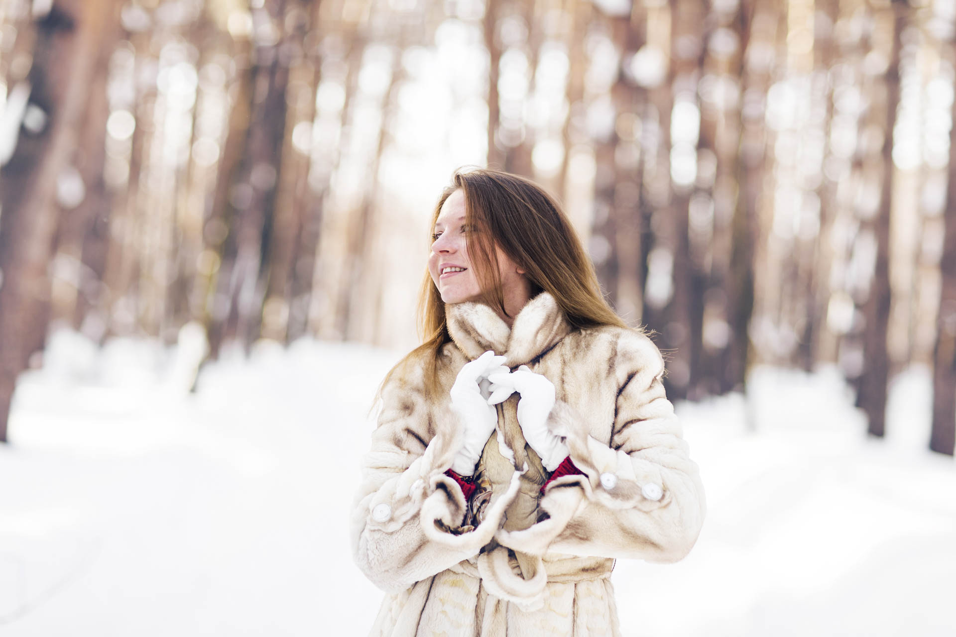 Winter portrait of young beautiful woman wearing fur coat. Snow winter beauty fashion concept.